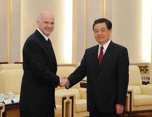 5月15日,中共中央总书记、国家主席胡锦涛在北京人民大会堂会见来华出席可持续发展问题研讨会的社会党国际主席帕潘德里欧等外方代表。这是胡锦涛与帕潘德里欧握手。新华社记者李学仁摄