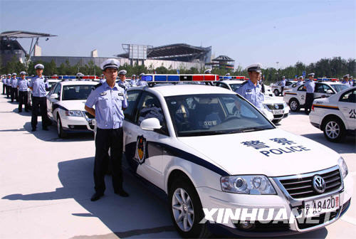 资料图片:北京交警在奥体中心南门准备出发。 新华社记者 陈建力 摄