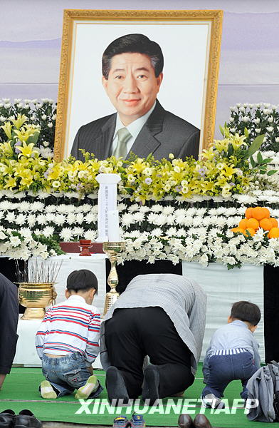 5月25日,在韩国前总统卢武铉的故乡庆尚南道金海市峰下村,人们在卢武铉的遗像前哀悼。新华社/法新