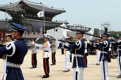 5月29日,仪仗队在韩国首都首尔市中心的景福宫举行的前总统卢武铉的遗体告别仪式上鸣枪。当日,韩国为卢武铉举行规模盛大的“国民葬”。新华社记者 黄本强 摄