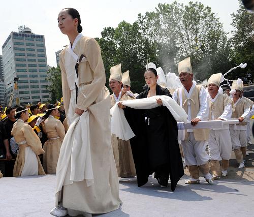 遗体告别仪式在这座朝鲜王朝正宫的兴礼门前院举行,大约2500名韩国各界人士和外国代表出席。韩国主要电视台借助设在首尔市中心的大屏幕实况转播现场画面。