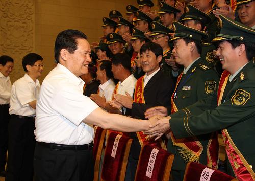 6月8日,公安边防部队群众工作报告会在北京举行。中共中央政治局常委、中央政法委书记周永康会见参加报告会的先进集体、先进个人并与代表座谈。新华社记者王建民摄