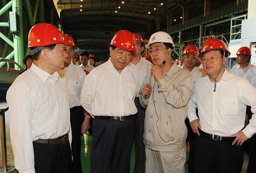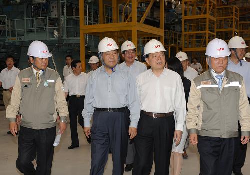 6月11日至15日,中共中央政治局常委、全国政协主席贾庆林在辽宁调研。这是6月12日,贾庆林在大连长兴岛临港工业区STX集团发动机工厂视察发动机生产情况。新华社记者 黄敬文 摄