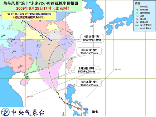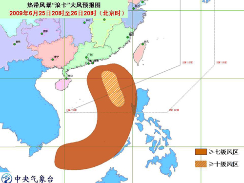 预计,风暴中心将以每小时15-20公里的速度向西北方向移动,以后将转向偏北方向移动,逐渐向广东中部到福建南部一带沿海靠近,强度有所加强,并有可能于明天夜间到后天白天在这一带沿海登陆。受“浪卡”和西南季风的共同影响,今天晚上到明天白天,南海东部和南部海面将有6-8级大风,“浪卡”中心经过的附近海面的风力可达9-10级。