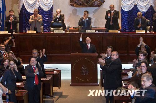 6月28日,洪都拉斯议会议长罗伯托·米凯莱蒂(中)在首都特古西加尔巴宣誓就任该国临时总统后向议会其他成员致意。洪都拉斯议会在当天举行的紧急会议上经过磋商和激烈辩论,通过了由议长米凯莱蒂出任国家临时总统的决议。 新华社发(戴维摄)