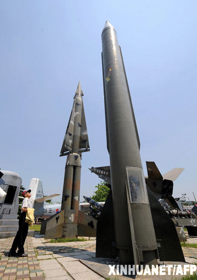 这张5月27日拍摄的资料照片显示,一名韩国人在首都首尔观看一枚朝鲜导弹(右)和一些韩国导弹的模型。新华社/法新