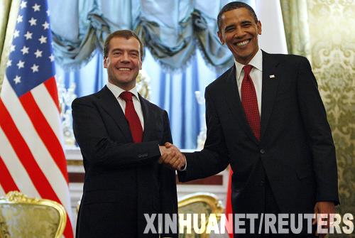 7月6日,俄罗斯总统梅德韦杰夫(左)在莫斯科与到访的美国总统奥巴马举行会谈。奥巴马当日抵达莫斯科进行为期三天的访问,这是他就任总统以来首次访问俄罗斯。 新华社/路透