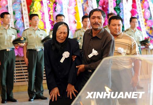 7月17日,万金刚生前的邻居、94岁的维吾尔族老人阿依木萨汗(左一)等前来送别万金刚烈士。当日,在乌鲁木齐“7·5”事件中壮烈牺牲的武警中队长万金刚烈士遗体告别仪式在乌鲁木齐市殡仪馆举行。新华社记者 沙达提 摄