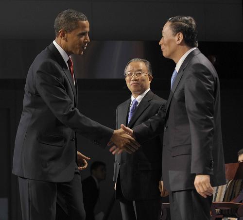 7月27日,首轮中美战略与经济对话在美国华盛顿开幕。中国国家主席胡锦涛特别代表、国务院副总理王岐山,国务委员戴秉国出席开幕式。这是美国总统奥巴马在致辞前问候王岐山(右)和戴秉国。新华社记者张岩摄
