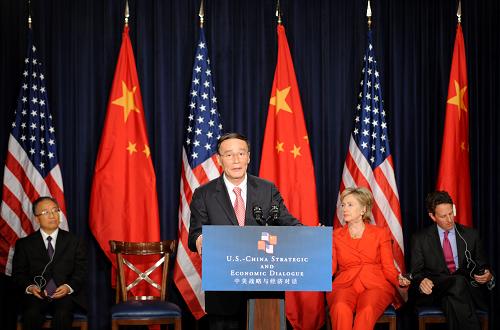 7月28日,中国国务院副总理王岐山(前)在美国首都华盛顿发表首轮中美战略与经济对话闭幕声明。当天,首轮中美战略与经济对话在华盛顿闭幕,中国国家主席胡锦涛特别代表、国务院副总理王岐山和国务委员戴秉国与美国总统巴拉克·奥巴马特别代表、国务卿希拉里·克林顿和财政部长蒂莫西·盖特纳共同主持了为期两天的对话。新华社记者 申宏 摄