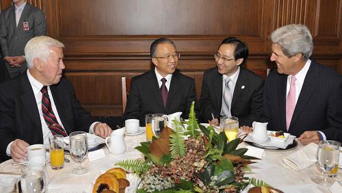 7月29日,中国国务委员戴秉国(左二)在美国华盛顿与美国国会参议员克里(右一)、卢格(左一)等共进早餐。 新华社记者 张岩 摄