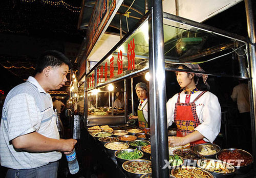 7月25日,一名顾客在夜市购买小吃。乌鲁木齐最大的夜市——“五一星光夜市”于7月21日晚重新开市。夜市里有维吾尔族的烤全羊、羊肉串、手抓饭、薄皮包子,回族的黄面、粉汤、油香,哈萨克族的奶茶、油果子,还有内地的刀削面、汤圆、米线、米粉、水饺等。游客在一阵阵吆喝声中享受各种美味,场面热闹。新华社记者章磊摄