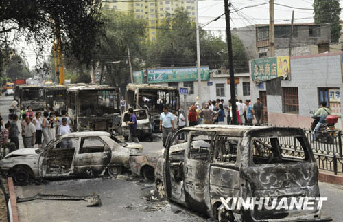 7月6日,乌鲁木齐市北湾街上停放着多辆被烧毁汽车。新华社记者 沈桥摄