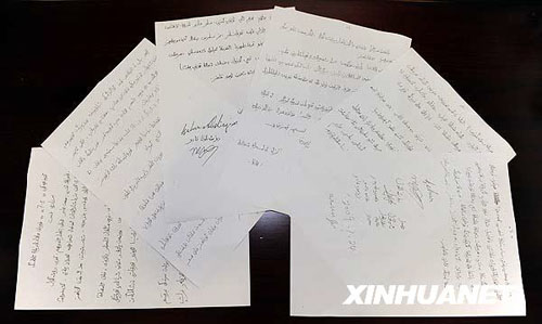 热比娅境内亲属分别致热比娅和乌鲁木齐“7·5”事件遇难者家属的信件(8月2日摄)。热比娅在境内的亲属--儿子卡哈尔、女儿茹仙古丽和弟弟买买提等,近日分别致信热比娅和乌鲁木齐“7·5”事件遇害者家属,对热比娅违背了自己的誓言参与分裂活动表示不满,对暴力事件表示气愤,对无辜死亡的群众和他们的家属表示歉意。新华社记者丁林摄