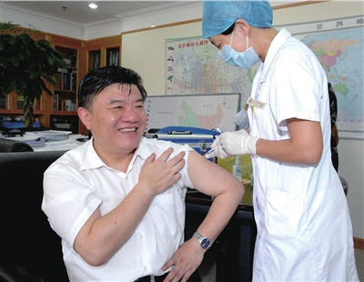 陈竺率先试种第二针甲流疫苗 全国13300多名志愿者将试种第二针 其中北京1513人已试种