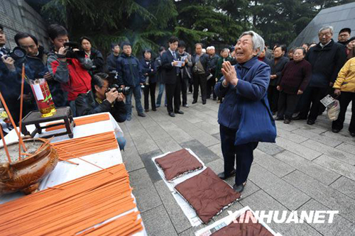 4月4日,一名南京大屠杀遇难者遗属在名单墙前祭拜当年遇难的亲人。当日,在绵绵细雨中,一批南京大屠杀幸存者及遇难同胞亲属,在侵华日军南京大屠杀遇难同胞纪念馆的遇难者名单墙前举行仪式,祭奠在1937年被侵华日军屠杀的亲人和其他遇难的中国同胞。新华社记者 韩瑜庆 摄