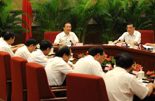 8月20日,国务院总理、国务院西部地区开发领导小组组长温家宝在北京主持召开领导小组会议,讨论并原则通过《关于应对国际金融危机保持西部地区经济平稳较快发展的意见》。 国务院副总理、国务院西部地区开发领导小组副组长李克强出席会议。新华社记者 刘建生 摄