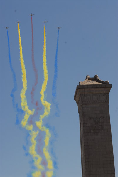2009年9月21日上午,北京,参加国庆60周年阅兵空中梯队在天安门广场上空进行预演。
