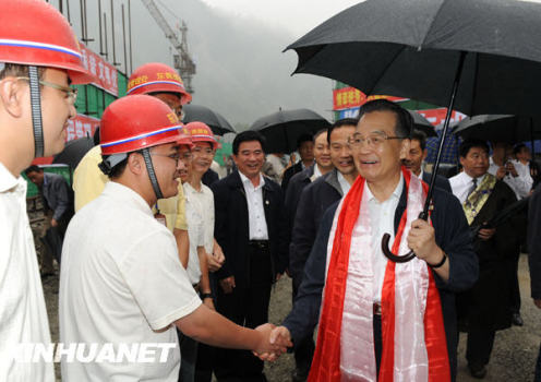 这是9月26日,温家宝在汶川县映秀镇建筑工地冒雨看望援建人员。新华社记者黄敬文摄