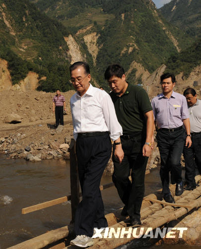 这是9月24日,温家宝在青川县红光乡东河口村踏着由几根枯树杆绑成的独木桥过河看望对岸的村民。新华社记者黄敬文摄
