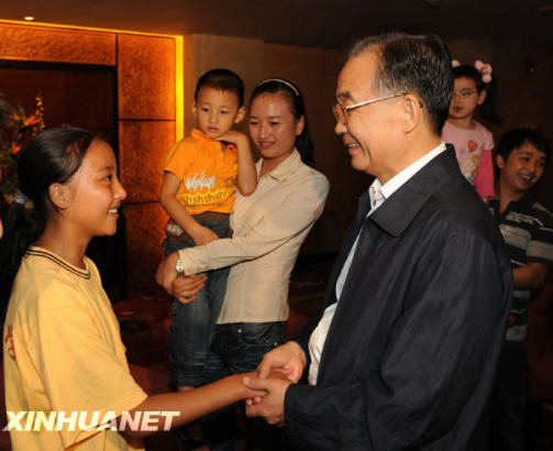 9月25日,中共中央政治局常委、国务院总理温家宝在绵阳邀请四川地震灾区部分基层干部群众会面。这是温家宝亲切地拉着在北川中学初中一年级读书的羌族小女孩刘小桦的手,询问她的学习和生活情况。新华社记者黄敬文摄