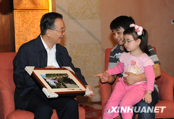 9月25日,中共中央政治局常委、国务院总理温家宝在绵阳邀请四川地震灾区部分基层干部群众会面。这是温家宝拿着照片,向4岁的宋馨懿(右)讲述他在北川县城外为刚刚获救的小馨懿让路的情景。新华社记者黄敬文摄