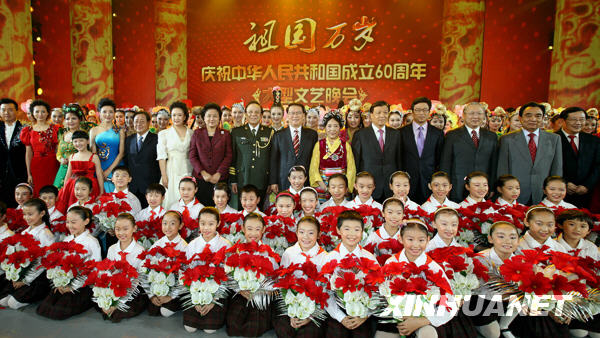 9月29日晚,“祖国万岁——庆祝中华人民共和国成立60周年大型文艺晚会”在北京举行。中共中央政治局常委李长春出席观看。这是晚会结束后,李长春与演职人员合影。新华社记者 姚大伟 摄