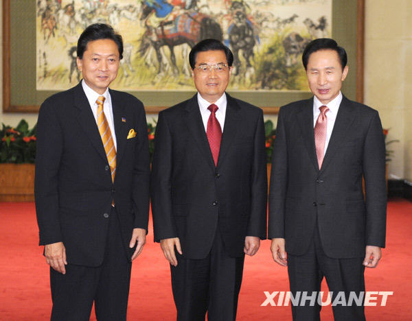 10月10日,国家主席胡锦涛在北京钓鱼台国宾馆会见前来出席第二次中日韩领导人会议的韩国总统李明博、日本首相鸠山由纪夫。新华社记者 李涛 摄