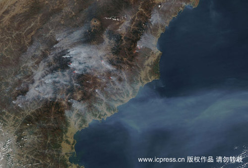 当地时间2009年10月15日,美国宇航局卫星在朝鲜上空拍摄到大型烟雾。美国宇航局(NASA)称朝鲜2009年10月中旬发生了大火,烟雾弥散到日本海上空。韩联社称,根据该烟雾的规模,可以猜测可能是由火灾所造成的,并且是很大型的火灾。但是,朝鲜方面尚未对此做任何报道。