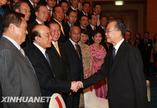10月23日晚,中国国务院总理温家宝抵达泰国华欣,出席在这里举行的第十二次中国与东盟领导人会议、第十二次东盟与中日韩领导人会议和第四届东亚峰会。这是温家宝总理在下榻酒店会见中国驻泰国使馆工作人员、华人华侨、中资机构和留学生代表。新华社记者 庞兴雷 摄