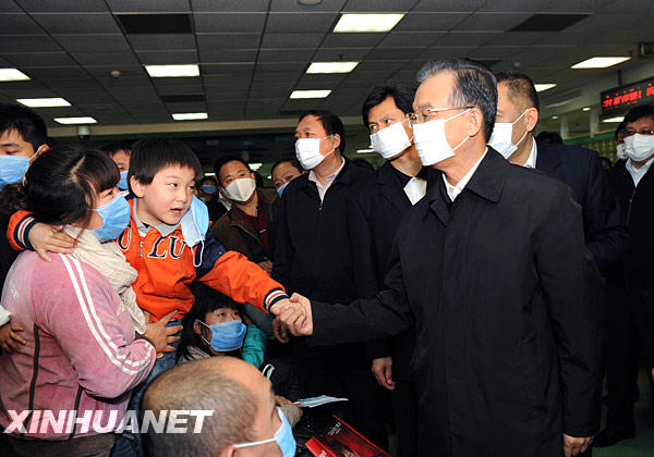 10月31日,中共中央政治局常委、国务院总理温家宝来到北京儿童医院,看望各地来此就诊的甲流患者,并向奋战在防控一线的医务工作者表示亲切慰问。新华社记者饶爱民摄
