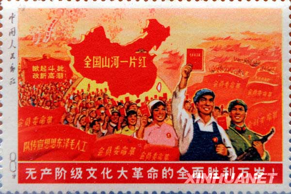 “全国山河一片红”在1968年文化大革命期间发行,北京邮票厂印制,面值8分。小幅邮票图案为工农兵手持《毛主席语录》,背景中“革命委员会”的红旗以及工农兵群众热烈欢呼的场面汇成红色海洋,画面上方为一幅中国地图,地图上除台湾外全部绘成大红色,并印有“全国山河一片红”金字;大幅的“全国山河一片红”尺幅为普通邮票的2倍,画面内容与小幅的相似,下书“无产阶级文化大革命的全面胜利万岁!”