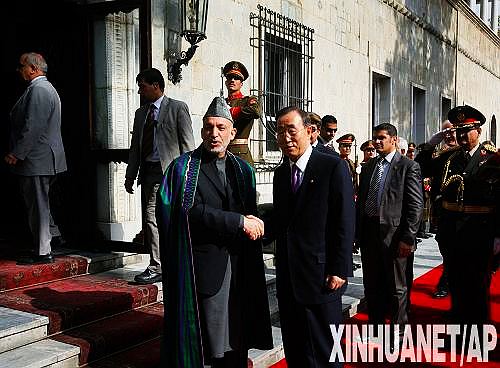 11月2日,阿富汗总统卡尔扎伊(前左)在喀布尔欢迎到访的联合国秘书长潘基文。当日,阿富汗独立选举委员会宣布,阿总统选举第二轮投票不再举行,现任总统卡尔扎伊获胜当选阿总统。新华社/美联