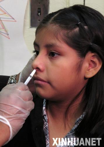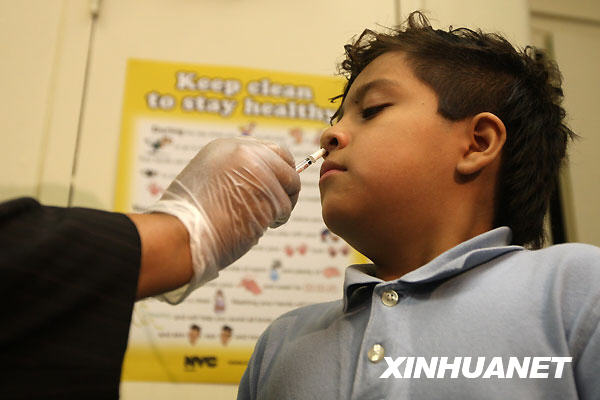 2009年10月28日,在美国纽约布鲁克林区的第157公立小学,一名学生正在接种甲型流感疫苗鼻腔喷剂。新华社记者刘欣摄