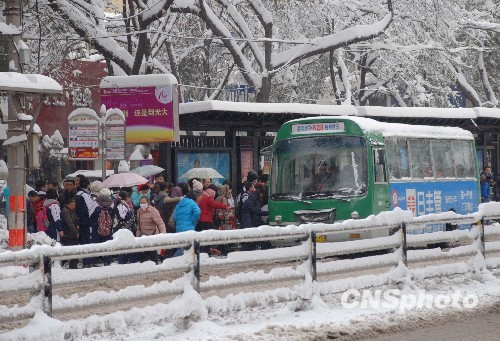 从11月9日至11日,山西大部地区出现强降雪天气,太原24小时降雪量达36.7毫米,是1951年有气象记录以来的最大降雪。山西省气象局启动暴雪灾害一级应急响应,山西省副省长刘维佳表示:此次暴雪灾害给山西的交通、农业、林业、电力等相关部门造成了不同程度的影响。图为太原市居民出行受暴雪的影响,只能选择步行或乘坐公交汽车。 中新社发 张雷杰 摄