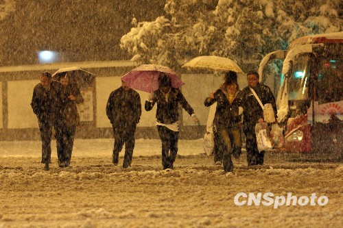 11月11日,一场由雨、雨夹雪、霰、冰粒和雪花形成的混合降水过程向古城西安呼啸而来,全区范围内普降中雪,局地出现了暴雪。据气象记录显示,今冬初雪是西安1987年以来最早的一场降雪,从降雪强度、降雪量及日最低气温来看也都是同期最强的。气象专家同时表示,在一次降水过程中,同时出现雨、雨夹雪、霰、雪花等多种降水方式的情况比较罕见,但也属于正常。中新社发梁萌 摄