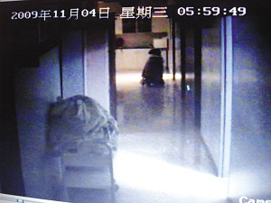 监控录像拍摄的徐宝宝母亲跪在医生办公室前的场景。