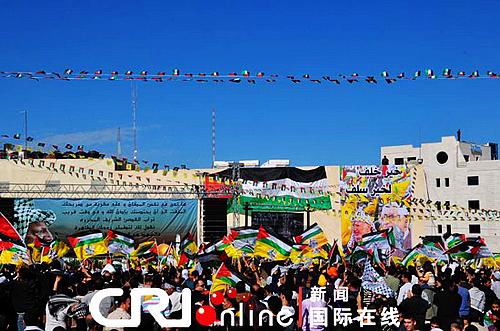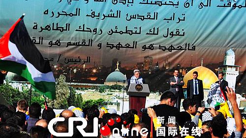 集会现场巴民族权力机构主席阿巴斯发表讲话,重申将以色列停止扩建定居点作为以巴复谈前提条件。