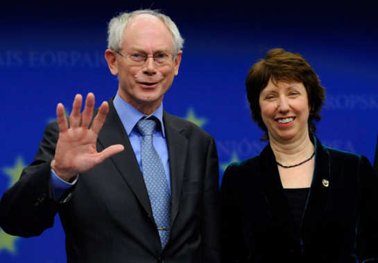 11月19日,布鲁塞尔,欧洲理事会首位常任主席范龙佩、欧盟外交和安全政策高级代表凯瑟琳·阿什顿出席记者会。