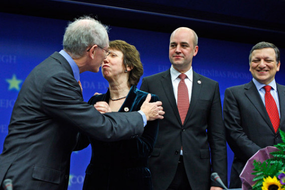 范龙佩和阿什顿互相庆贺当选,一旁为瑞典首相赖因费尔特,欧盟委员会主席巴罗佐。