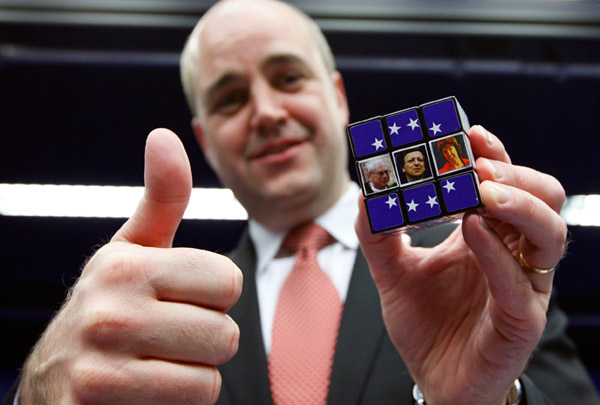 欧盟轮值主席、瑞典首相赖因费尔特展示一个饰有范龙佩、巴罗佐和阿什顿头像的魔方。