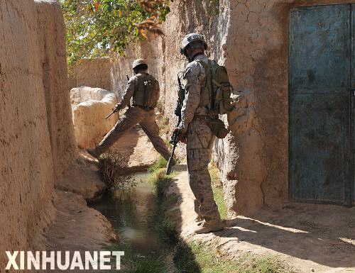 资料图片:11月3日,两名美军士兵在阿富汗西部法拉省的一处谷地巡逻。新华社发