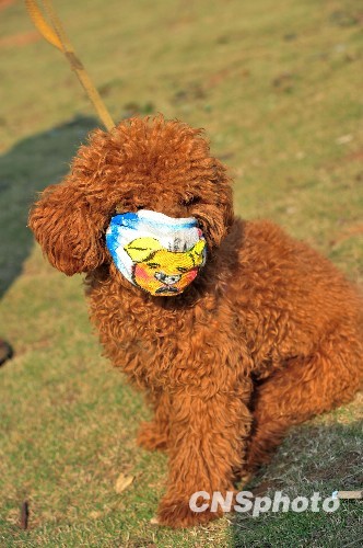 11月24日,在湖北恩施市凤凰山森林公园内,一只宠物狗被主人穿上保暖衣、戴上口罩,在草坪上晒太阳。狗的主人说,在网上看到世卫组织专家告诫宠物也要防甲流的消息后,每次外出遛狗时,他就给宠物狗穿上保暖衣、戴上自制的口罩。 中新社发 杨顺丕 摄
