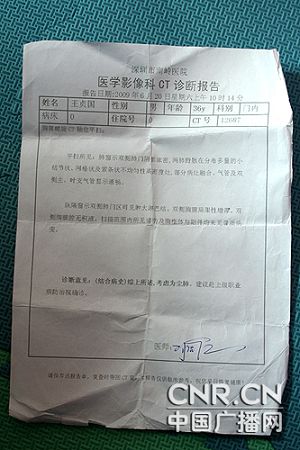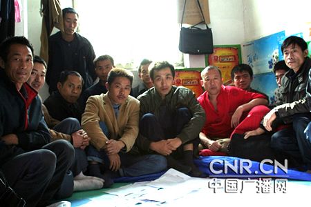 说话的人叫钟家泉,是这群农民工的代表,记者见到他是在深圳市郊的一处简易房内,包括厕所在内,房间面积不超过10平米,而这里却住着他的10多位工友,地上没有床,救济站提供的棉被是房间里唯一的家具。这些人有的因为病痛已经无法工作,有的因为疑似尘肺而被包工头辞退,难闻的气味和对死亡的恐惧弥漫着整个房间。他们因为职业病检查受阻而走到一起,目前已有120多人。他们都有不同程度的咳嗽、胸闷、呼吸困难等症状。工人们说,十多年来他们一直在深圳当炮工,每天都要吸入大量粉尘,但以前并不知道这会危及生命。他们说,自己已经有两三个老乡死了,死掉的时候他们都亲眼看到了,现在感觉自己的身体和死掉人的症状几乎相同。而一位在湖南张家界中医院做过检查的工友说:医生照出来一看,说这个病很严重,最后,我跟他说明了,我说我打了几十年风钻,他说肯定是尘肺病。