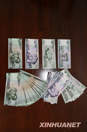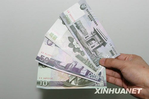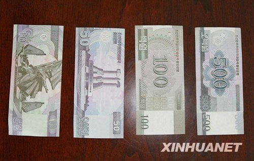 朝鲜在11月30日至12月6日更换了货币。旧货币与新货币的兑换率为100比1,即100元旧货币兑换为1元新货币。新发行的货币纸币面值分别为5000元、2000元、1000元、500元、200元、100元、50元、10元、5元9种,硬币有1元、5角、1角、5分、1分5种。新华社记者张滨阳摄
