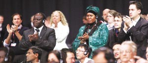 气候大会结束后,疲惫的代表们鼓掌欢迎。