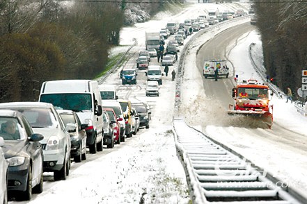 法国西北部积雪阻路,汽车排长龙