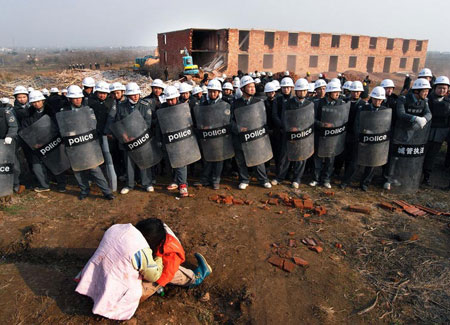 2009年12月17日,武汉市洪山区公安、城管、规划等部门展开联合行动,组织800多名执法人员强制拆除左岭镇3个村近4万平方米的违章建筑时,遇到了抗拒拆迁的村民,强拆队伍就用盾牌组成人墙将人隔离在外。