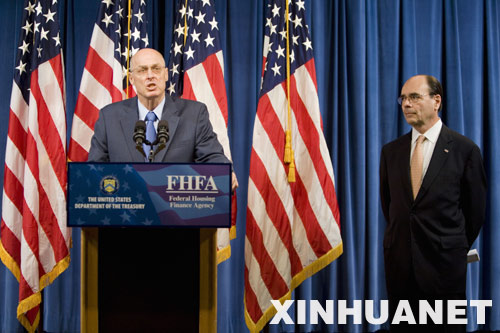 资料图片:2008年9月7日,美国财政部长保尔森(左)和联邦住房金融局局长詹姆斯洛克哈特在新闻发布会上宣布,美国政府接管陷入困境的美国两大住房抵押贷款融资机构房利美和房地美。新华社发