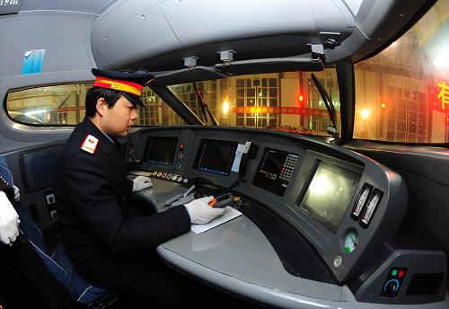 12月26日凌晨,出库司机准备将首列动车组从武汉动车基地开出库房,进入武汉火车站,执行首次武汉到广州的高速运营。新华社记者 程敏 摄